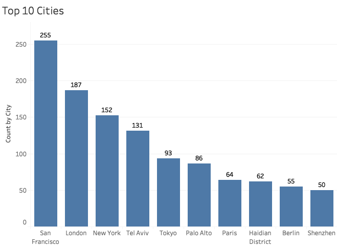 Above are the top 10 cities by the number of AI companies. San Francisco, London and New York make up the top 3. The numbers by city on my dashboard differ from those presented by Asgard itself. The difference, I suspect, comes from the way cities are grouped. I didn’t do any grouping. All visualizations come straight from the data itself while I suspect that there must have been some grouping by Asgard. Nonetheless, the figures by country present no difference.
