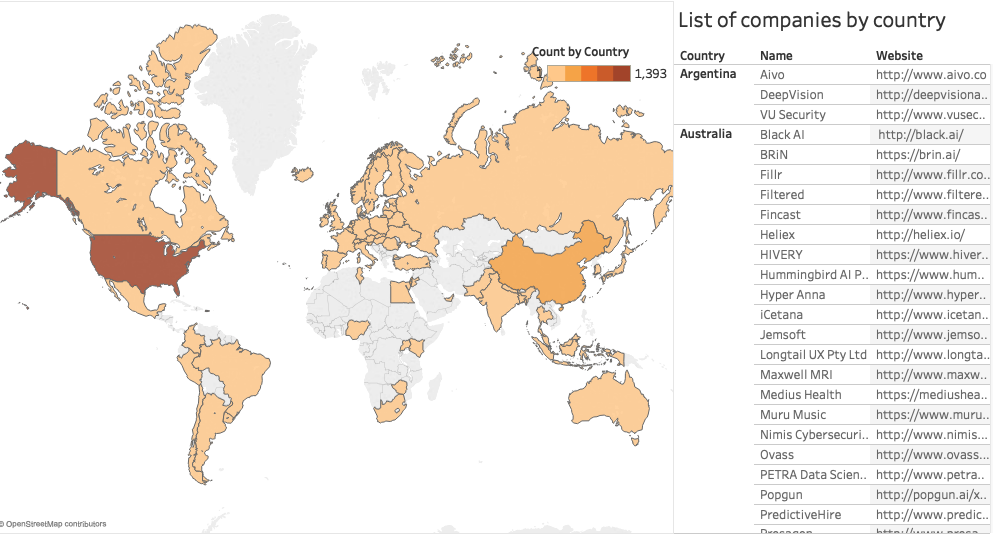 This is a little personal project, using Tableau to visualize the data from Artificial Intelligence Landscape in 2018 by Asgard. All copyrights related to the data are owned by Asgard. I just applied some simple analytics and visualization.