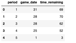 periodstats = madeshot.groupby(by='period', as_index=False).agg({"game_date": pd.Series.nunique, 'time_remaining': pd.Series.nunique}) #the data frame's name is madeshot. Pd is the abbreviation of Pandas