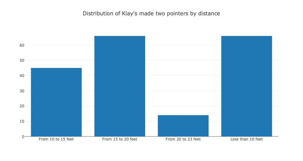 - Regarding Klay’s made two-pointers, below is the distribution by distance. He seems to be more effective within 10 feet of the basket and from 15 to 20 feet.