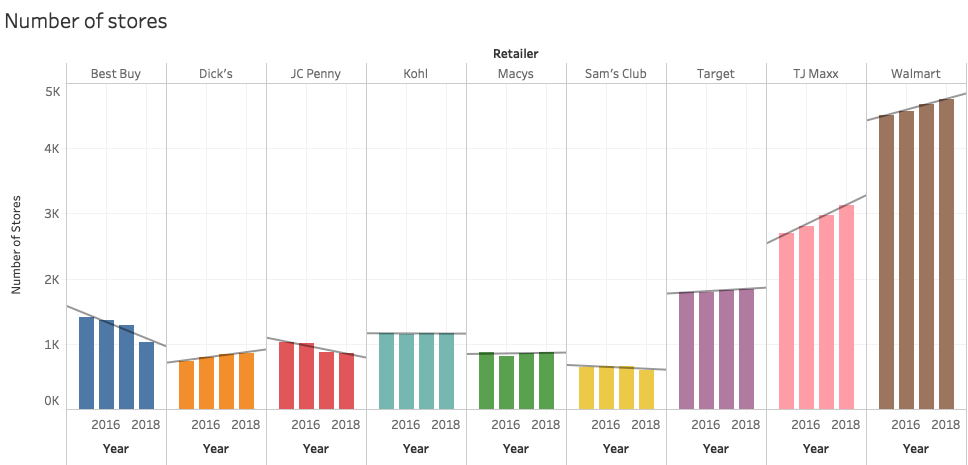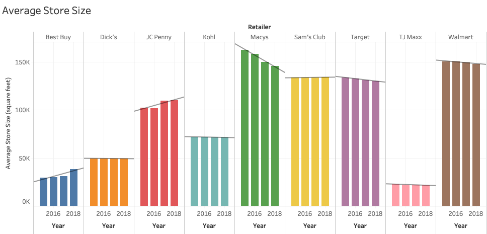 Best Buy, JC Penny and Sam’s Club increased their average store size. The rest decreased theirs, except Dick’s, which keeps their store size more or less the same for the past 4 years