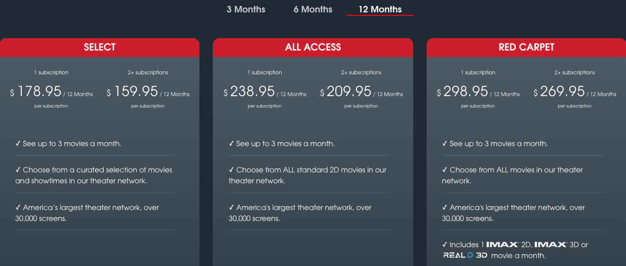 For the sake of simplicity, I only looked at the one that would allow users to watch movies in 3D and IMAX. After some calculations, a user is expected to pay at least $8.21 and $8.30 for a movie, with 3-month and 12 month subscriptions respectively, provided that such a user will go to theaters 3 times a month. It’s a bit surprising that it costs more on average per movie to have a longer subscription. Nonetheless, multiple yearly subscriptions will bring the average ticket price per movie down to around $7.5.