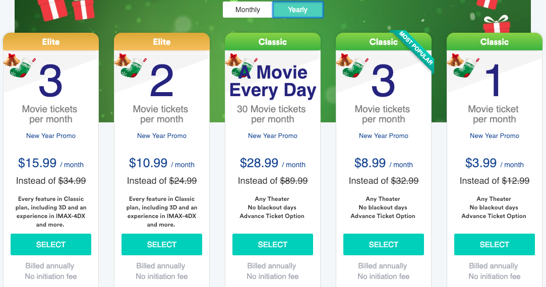 For Sinemia, prices are structured a little bit differently. There is an initiation fee of $20, depending on whether the subscription is monthly or yearly.