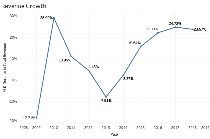 Except the two years after the launch (2012 and 2013) and 2018, revenue growth has been climbing. The past three years have seen a revenue growth of more than 20% on average.