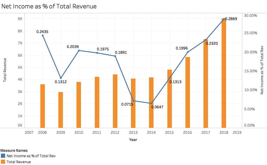 Even though the trend looked negative from 2008 to 2013, the past 5 years has seen an amazing streak of increase in net income as % of total revenue.