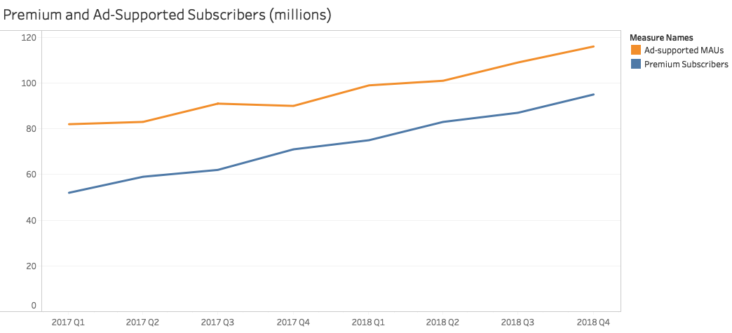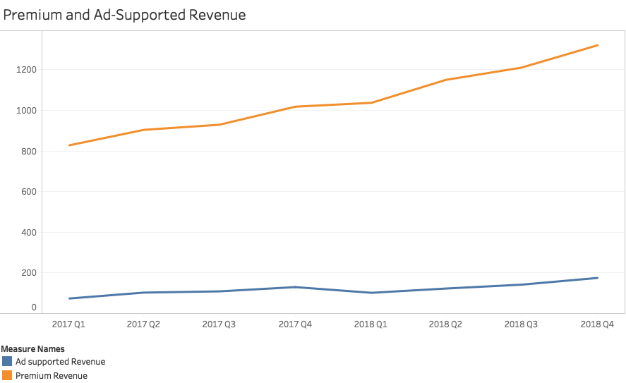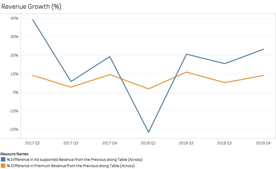 Both Premium and Ad-Supported revenues seem to be affected by seasonality. Ad-Supported revenue growth fluctuates more than Premium revenue growth. In 2018, revenue from ads grew faster than subscription-based revenue.