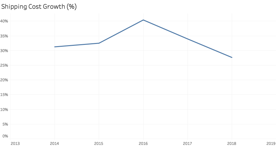 Shipping costs have been growing at a 2-digit clip since 2013, a concern that many analysts and investors expressed. However, the growth rate has slowed down since 2016
