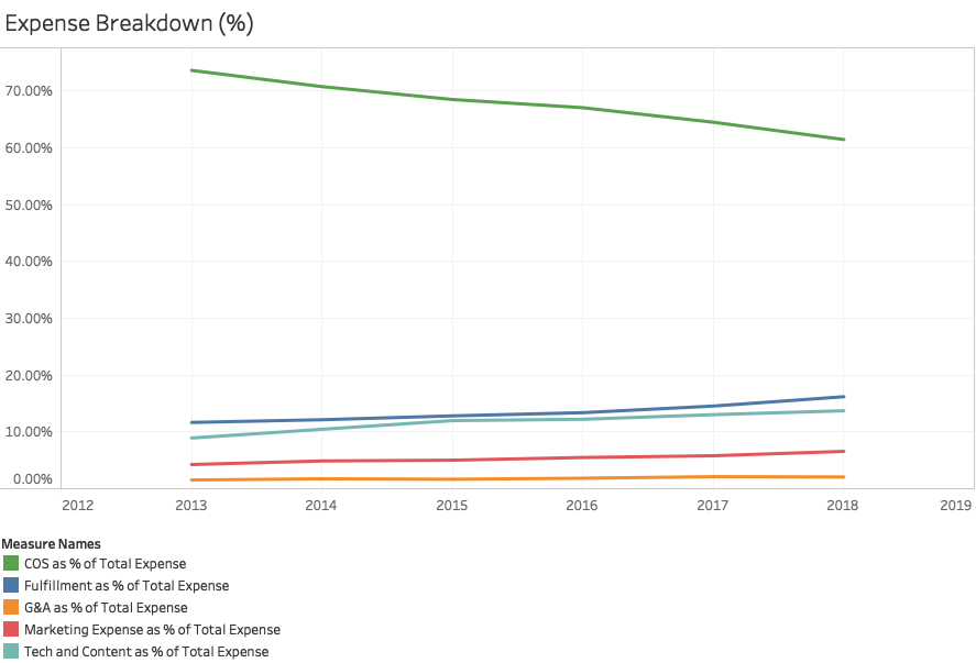 In terms of expense breakdown, Cost Of Sale is still the dominant item, though its contribution to the total expense has been declining steadily. There is one item called Other Expenses in the reports, but I decided to ignore it since it wasn’t significant compared to other items.