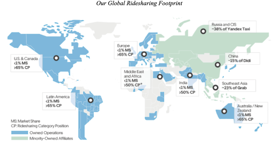 In August 2016, we completed the sale of our operations in China to Didi in exchange for an approximate 18.8% interest in Didi, which, based on our current information, we estimate to be 15.4% as of September 30, 2018. In February 2018, we consummated a joint venture with Yandex whereby we and Yandex each contributed our operations in Russia/CIS to a joint venture which we refer to as the Yandex.Taxi joint venture. We received a 38.0% interest in the Yandex.Taxi joint venture at the closing of the transaction, which, based on our currently available information, we estimate to be 38.0% as of December 31, 2018. In March 2018, we completed the sale of our operations in Southeast Asia to Grab in exchange for a 30.0% interest in Grab, which, based on our currently available information, we estimate to be 23.2% as of December 31, 2018. We measure our interest in each of our minority-owned affiliates based on the outstanding shares of capital stock on an as-converted basis but without taking into account securities exercisable or exchangeable for shares of capital stock or its equivalent (including outstanding vested or unvested stock-based awards and any reserved but unissued stock-based awards under any equity incentive plan of our minority-owned affiliates).
