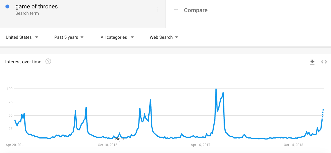 The previous spike in 2017, as shown in the screenshot above, looks like Arya next to the Mountain, which is the expected spike this week. Data from Google predicts that folks will search on and talk about the show a whole lot this week.