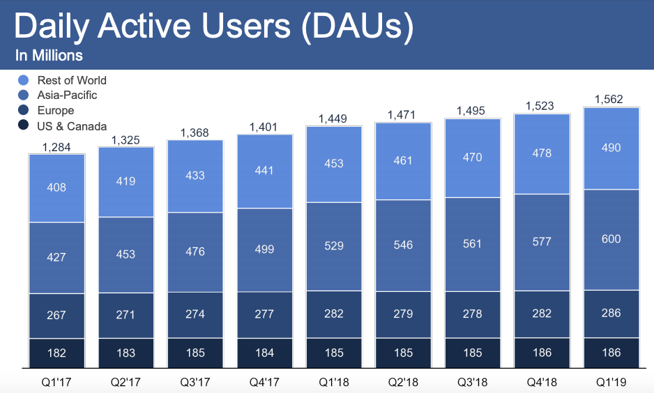DAUs year-over-year growth in fiscal year 2019 slowed down compared to Q1 2018.