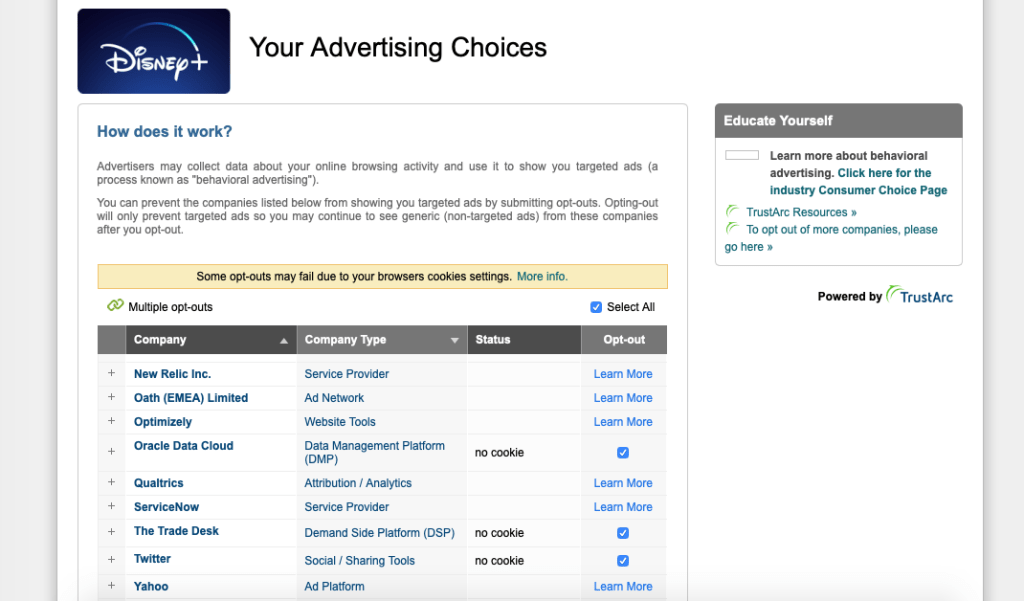 At the bottom of the website, there is a tab called “Interest-based ads”. On that page, you can choose to opt out of behavioral targeting by ads companies on disneyplus.com
