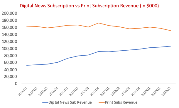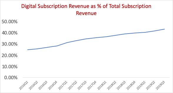 In terms of its importance to the subscription segment, digital subscription revenue has been on the rise. In Q3 2019, it made up slightly more than 43% of the total subscription business, the all-time high mark