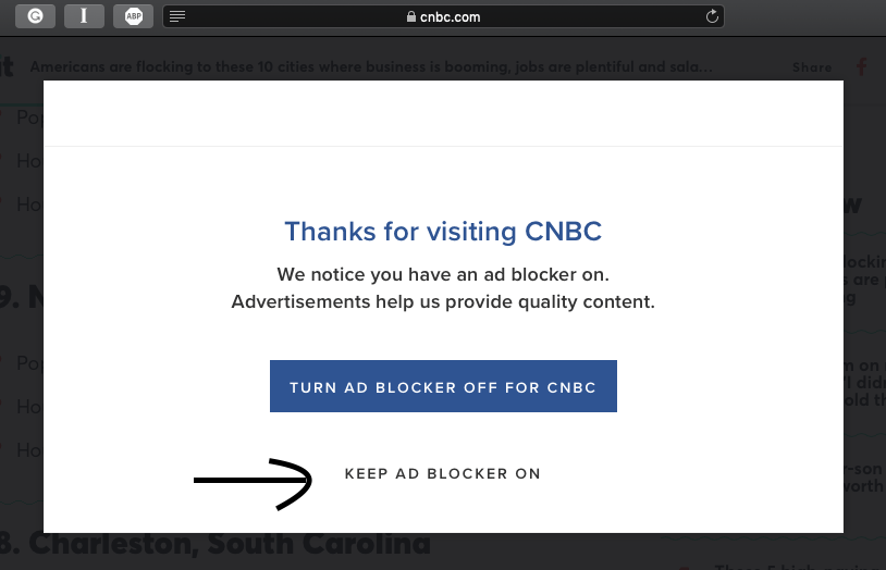 CNBC provides a respectable example of how to ask audience to turn off adblocks while giving them an option to continue on