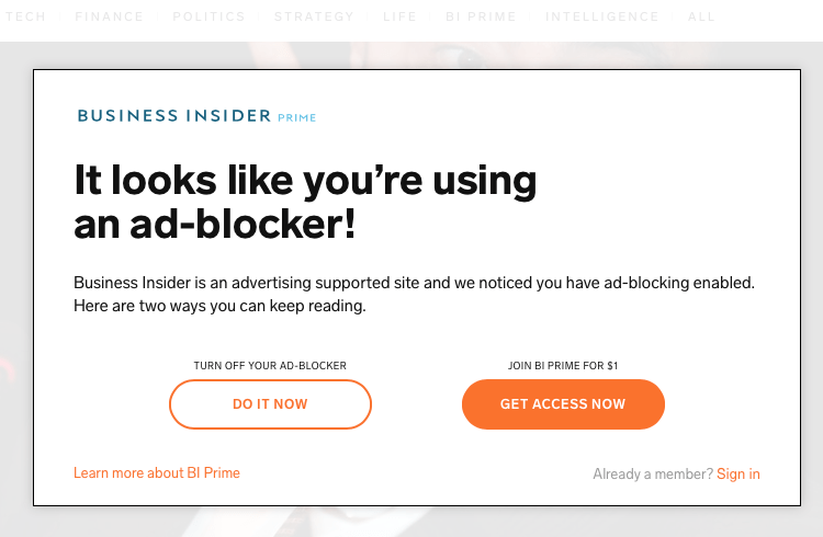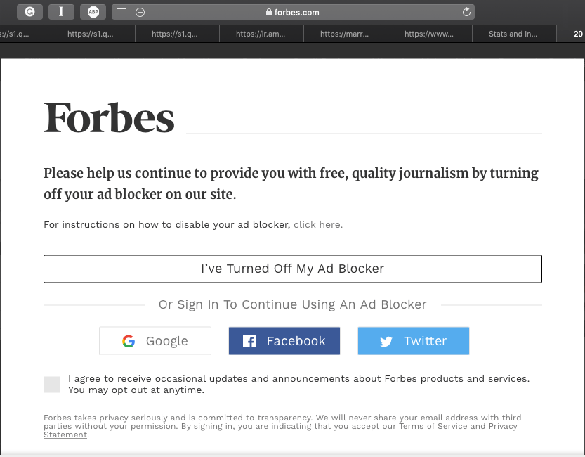 It’s officially 2020 and I find it baffling to see websites that literally force readers to turn off ad-blockers or sign in and give away personal information before being able to read content that may not even require a subscription. Take Forbes and BusinessInsider as examples. Here is what you’ll be greeted with when arriving at a Forbes article