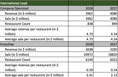 For International Lead Markets, compared to 2017, average revenue and sale per restaurant increased for both company-operated and franchised outlets.