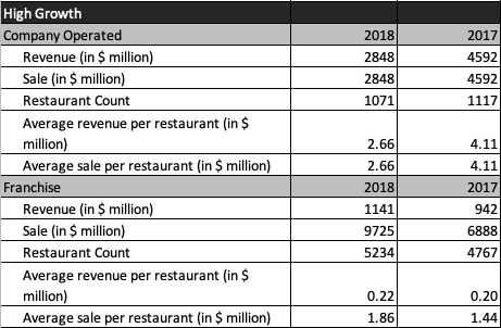 The timing of new and closed restaurants varied from one market to another and it made the calculation of average revenur or sale per restaurant tricky. Nonetheless, if we can make simple assumptions and take the revenue as well as restaurant count at year end, we can compare 2018 vs 2017 to see where the business is going