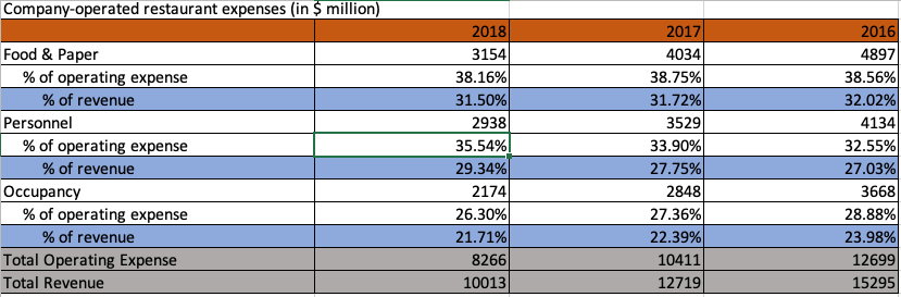 When looking at the expense structure for company-operated restaurants, food and paper is the biggest piece of the pie, even though personnel registered the biggest growth YoY compared to 2017.