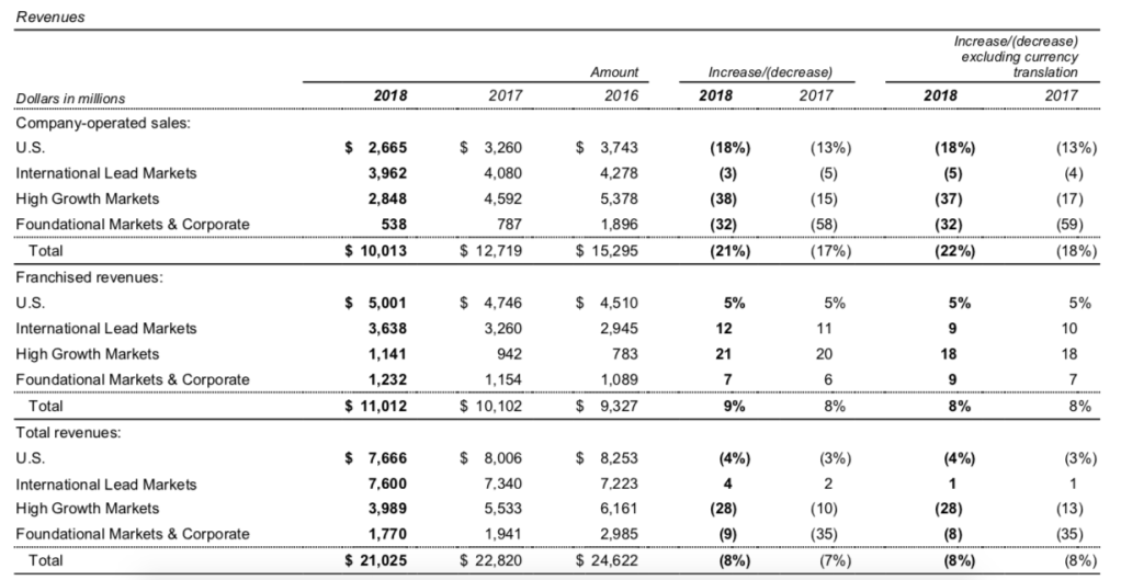 Systemwide revenue has been decreasing since 2016. The main reason for the decline was attributed to company-operated segment as it shrank by 21% and 17% year over year in 2018 and 2017 respectively. Additionally, the chart showed that International Lead Market was the only segment that registered revenue growth in 2018. High Growth Market delivered the biggest growth in franchised revenue, but also the biggest decline in company-operated revenue. Concerningly, the high growth market segment registered a decrease in revenue while it should have been the opposite, essentially due to the decline in company-operated revenue.