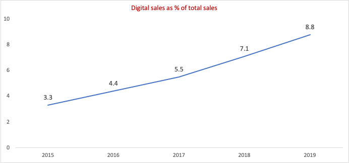 For the improved financial performance, Target credited its increased efficiency and customer engagement through both its stores and digital channels. he company revealed that 80% of online orders were fulfilled by its stores. Additionally, “during 2019, over 70% of our comparable digital sales growth was driven by same-day fulfillment options: Order Pickup, Drive Up, and delivery via our wholly-owned subsidiary, Shipt”. In its latest business update amid Covid-19, Target said that digital sales grew more than 100% YoY. The growing importance of digital channels to Target’s business can be seen in the below graph which shows digital sales made up an increasing share of Target’s overall sales in the last 5 years.