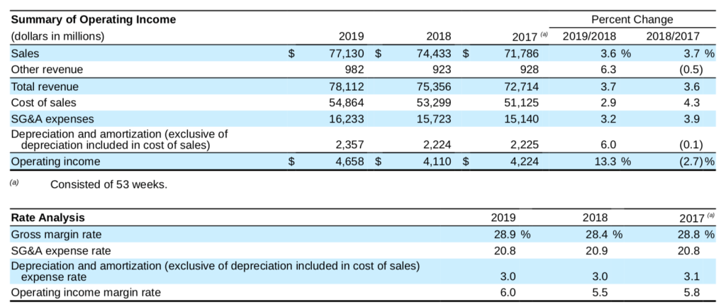 2019 total revenue, gross margin rate and operating income margin rate increased compared to 2018. Walmart’s YoY increase in the latest year’s revenue is 1.9%, lower than what Target posted. Considering the cut-throat competition that Target is in, that increase in the top line and margin should be a positive sign.