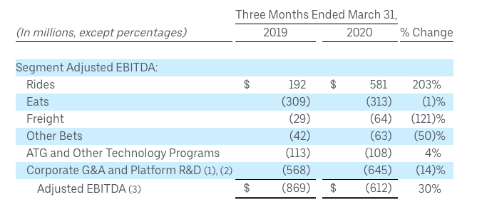 Like many other companies, Uber had its operations seriously disrupted by the Coronavirus. Rides bookings had a YoY growth of 20% in the first two months through February before plummeting to a decline of 40% and 80% in March and April respectively when the lockdown took hold. Eats, on the other hand, had a 54% YoY growth in bookings and 124% YoY increase in net revenue with take-rate of 11.3%, not too far from their long-term goal of 15%. Eats, for this quarter, remains the biggest loss-making segment, even though Freights’ loss growth is significantly bigger while Rides is still the only profitable business