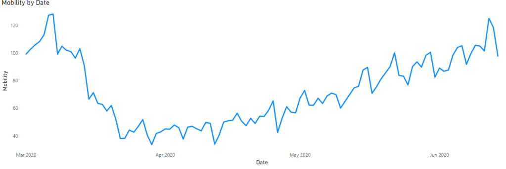 Rolling average is a technique used to address the short term volatility and fluctuation of data. In this example, I used the Apple Mobility Data for the state of New York. The data is from 1st March 2020 to 14th June 2020, which is the latest date when the data is available as of this writing. My dataset has only two columns: date and mobility. Here is what it looks like in Power BI