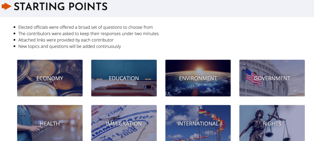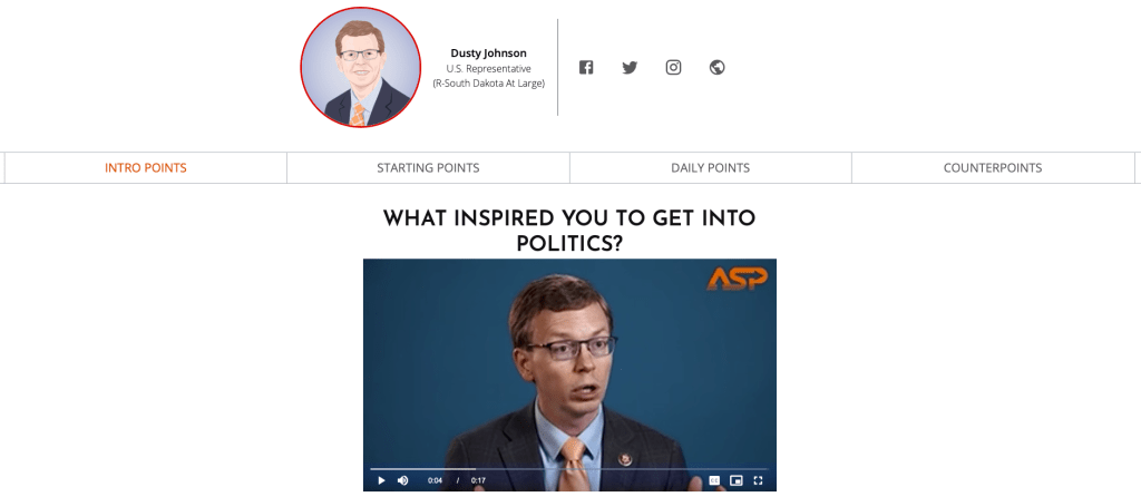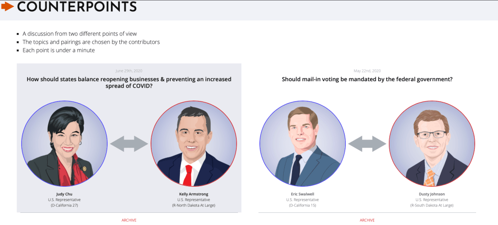 It is essential that voters are as informed and have a balanced view as much as possible on issues. An appearance by an official on a news channel doesn’t come with counterpoints from the other side. There are debates on the House and Senate floors, but who will watch those debates that can last for hours? Having different viewpoints on one issue in one place is beneficial to voters who want to learn more about pressing issues. Throughout its website, I think ASP wants to accomplish that. Either StartingPoints or CounterPoints, you can see Democrats and Republicans present their thoughts and ideas. As a result, viewers can take away different points of view and leave with a balanced dose of information.
