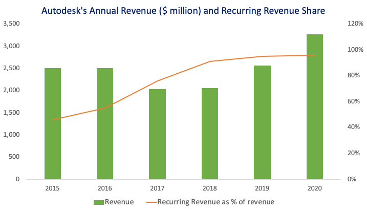 In FY 2020, Autodesk recorded its highest revenue ever at almost $3.3 billion, up 27% from FY 2019 which in turn was up 24% from FY 2018. Recurring revenue rose from 46% in 2015 to an astonishing 96% in 2020. Remaining Performance Obligation (RPO), which refers to revenue that is contractually stated, yet realized, in FY 2020 was more than $3.5 billion. Subscription Annual Run Rate, a key performance metric in subscription model, went up to $3.1 billion in FY 2020 from $1.2 billion in FY 2018. Subscription revenue in 2020 stood at $2.7 billion, up 53% YoY, offsetting the decrease in maintenance revenue.