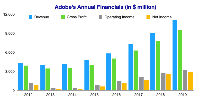 The decision to switch to subscriptions is massive for Autodesk. It enables the company to be more agile and unlock more value for both customers and shareholders. From what I have seen, the future is bright for the company. There are a lot of tailwinds behind Autodesk and the fact that its revenue has grown since the switch to subscriptions signals a positive acceptance from customers. One look at Adobe can offer a bit more perspective. Adobe started its journey to subscription-based model in 2012. Below is how much the company has grown since then