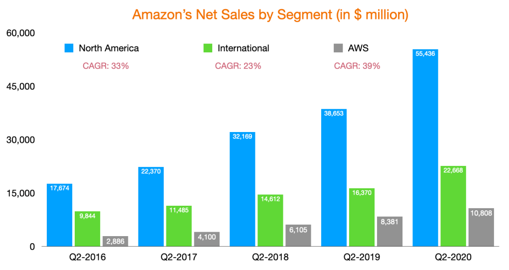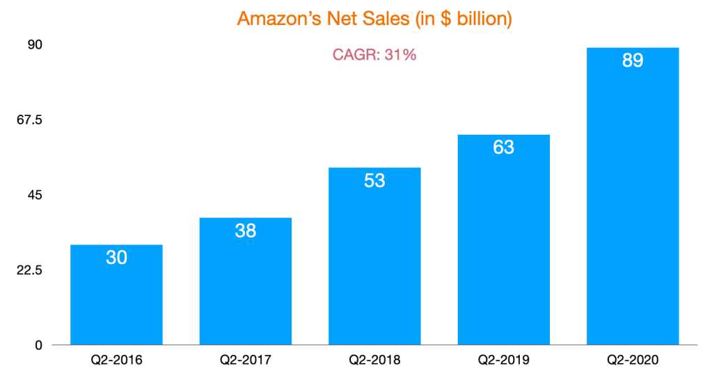 Even during the pandemic, Amazon net sales were $89 billion in Q2, up 40% YoY. In fact, if you look at their net sales in Q2 in the last 5 years, it’s an astounding 31% CAGR.