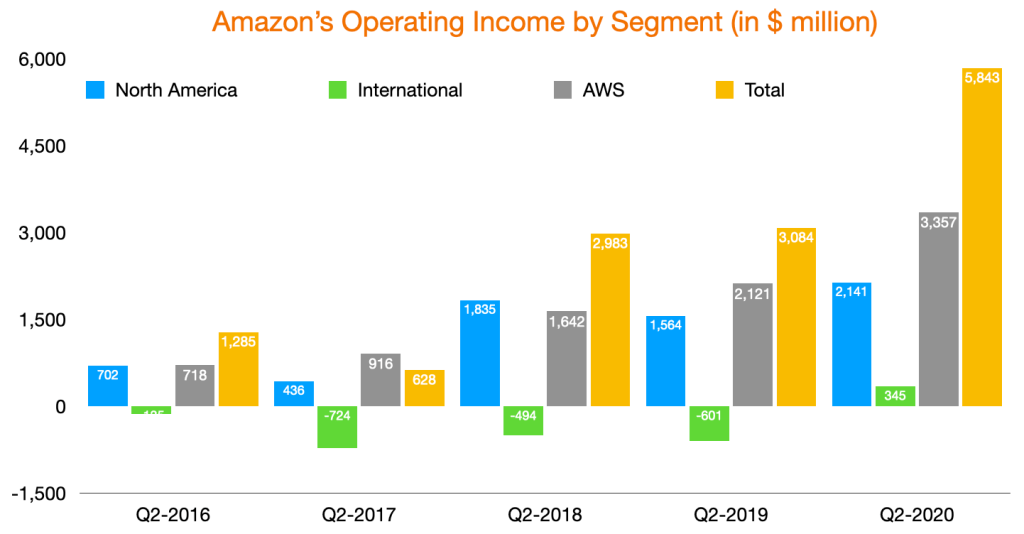 AWS continued to account for more than half of Amazon’s operating income. Historically, Amazon lost money on their International front, but in this quarter, the segment recorded $345 million in Operating Income. Total operating income was up to more than $5.8 billion, almost up by 90% YoY. Once again, this was during a pandemic.