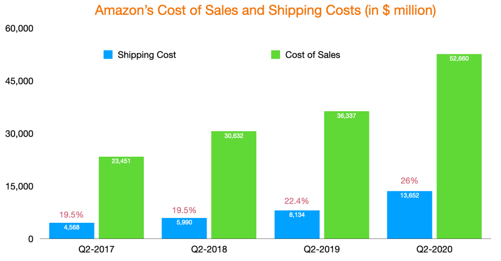 Shipping costs grew to more than $13.6 billion in Q2 FY 2020, from $4.56 billion in Q2 FY 2017. In the last four years, shipping costs rose at a faster pace (44% CAGR) than the combined net sales of online stores and 3rd party (28%). As share of cost of sales, shipping costs accounted for 26% of total cost of sales (AWS’ cost of sales weren’t recorded here), up from 19.5% in Q2 FY 2017. According to Amazon’s 10Q, here is how they define Cost of Sales