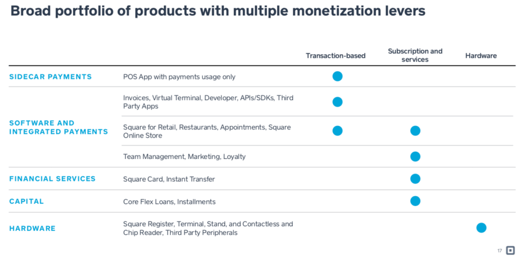 - Transaction-based revenue: Square takes a small cut from every transaction from some services that they help facilitate through products and services
