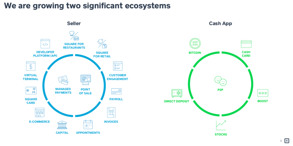 Fast forward to 2020, you can hardly recognize that Square company. It has grown leaps and bounds so that their offerings expanded to include a set of solutions for business and consumers. On the seller ecosystem side, Square offers software, hardware and financial services, namely: