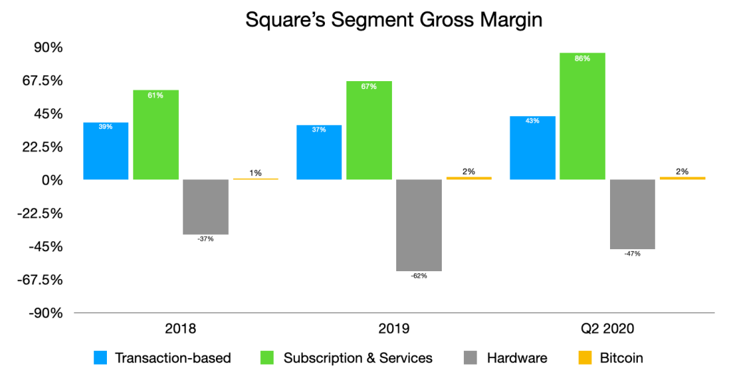 Among Square’s segments, hardware is consistently the one that loses money. It’s the case of razor and blades. Square is willing to lose dozens of millions on hardware if that means they can make hundreds of millions of dollars in return from services. Meanwhile, Bitcoin’s gross margin is routinely at 2% while Square has made great improvements on the margin of Transaction-based and Subscriptions & Services.