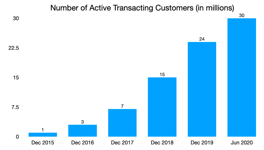 Square defines “active transacting customers ” as those who have at least one cash inflow or outflow during a month. The base that had 1 million active transacting customers in Dec 2015 grew to 30 million in June 2020. Covid-19 helped accelerate the use of Cash App as these customers transacted 15 times per month or more on average every other day, up 50% from a year ago.