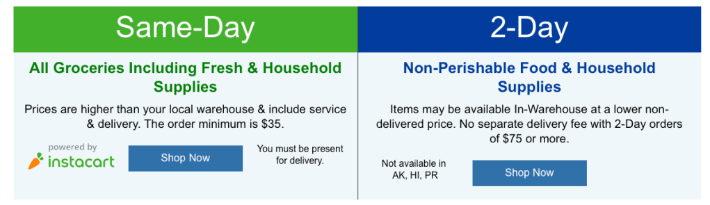Other grocers or retailers follow almost the same playbook. Deliveries have to meet a certain threshold to be free and if retailers don’t handle delivery themselves, they’ll partner with Instacart. In that case, customers either pay a small fee for each delivery or enroll in a membership with Instacart (in either case, you are expected to tip drivers). Each retailer will appeal to shoppers in a different way. Take Aldi for example. Its unique selling point is inexpensive fresh groceries. Look for cheap grapes and great Greek yogurt? Head to Aldi. The downside is that Aldi carries few SKUs and less flexibility for shoppers. Target offers much more flexibility and choice as it carries more items, but its groceries are significantly more expensive than those at Aldi or Walmart, in my experience. Costco seems to match Walmart on the grocery front. A Costco member (at least $60/year) can have free grocery delivery for orders of $35+. Groceries at Costco are competitive in prices, compared to those sold at Walmart. Other items can have free delivery too, and with no minimum order requirement, but it will take at least two days.