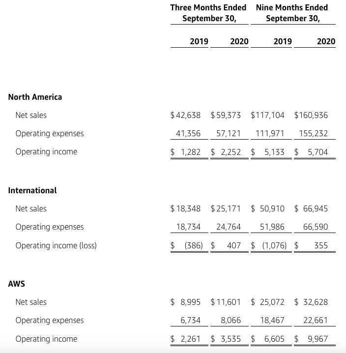 Amazon continues to amaze me with another blow-out quarter in Q3 FY2020. Their total net sales increased by 37% compared to the same period a year ago, reaching $96 billion, while Operating Income increased by 96% from $3.2 billion in Q3 FY2019 to $6.2 billion this quarter. It’s an extraordinary growth for a company that generated more than $1 billion a day in net sales this quarter. Their gross margin in general didn’t change much from a year ago, but their operating margin increased by almost 200 basis points from 4.5% in Q3 2019 to 6.4% in Q3 FY2020. While the high level margin doesn’t look impressive, the devils are in the details if we look closer at their segments.