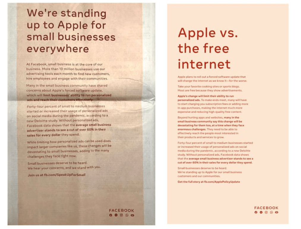 This week, Facebook ran a PR campaign targeting Apple, saying that ATT would harm small businesses whose survival depends on running ads. Here are the ads: