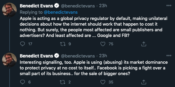 As you can see from Tim’s tweet, all ATT does is to force advertisers to seek users’ authorization to collect user data. It DOES NOT take away their ability to track. Plus, Facebook can customize the prompt message and convince users why it is in the user best interest to let Facebook collect their data. It is true that a prompt like that is pretty much similar to a NO, but at the end of the day, doesn’t it make sense to let users have a say in how their data is collected? Furthermore, Apple’s operating systems are its intellectual property. If Facebook wants to reach users on Apple’s devices and OSes, then Facebook has to comply with the rules that Apple sets. If the shoe were on the other foot, as in if a vendor was complaining about the rules Facebook sets on its platform, what would Zuck and his co. say then?