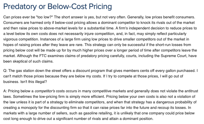 When it comes to predatory pricing, it’s a bit more complicated. First of all, to many consumers, a giant like Amazon bullying a smaller rival like Diapers.com looks very distasteful, but to the FTC, it may not necessarily be illegal. Here is what the FTC currently says about predatory pricing
