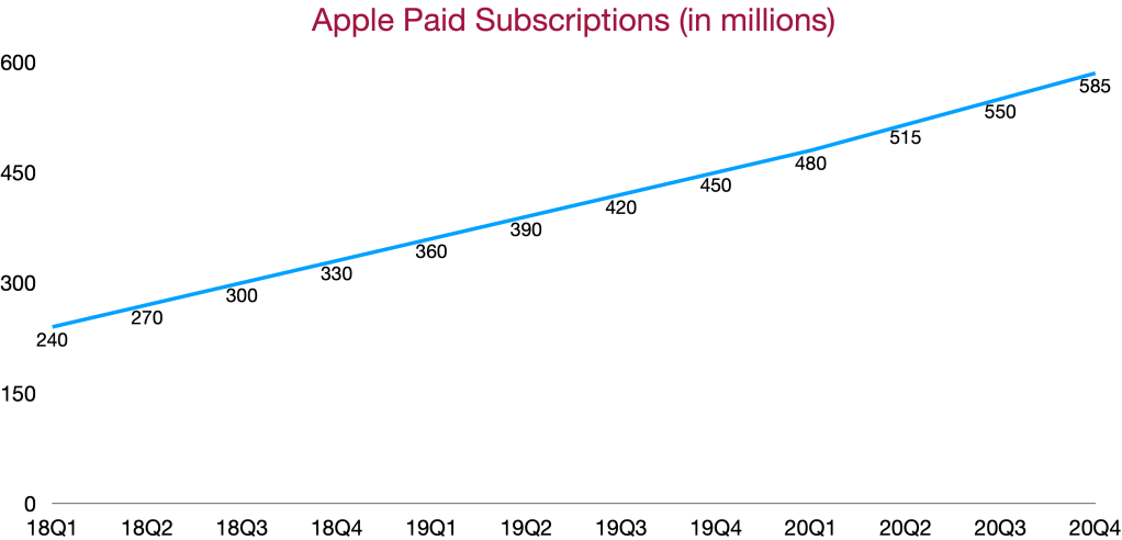 The growth of their Services is also reflected by the steadily expanding number of paid subscribers. In Q4 FY2020, Apple announced that they had 585 million paid subscribers and were well on track to finish the calendar year 2020 with 600 million subscribers. Only two years ago, the subscriber base stood 330 million as of Q4 FY2018.