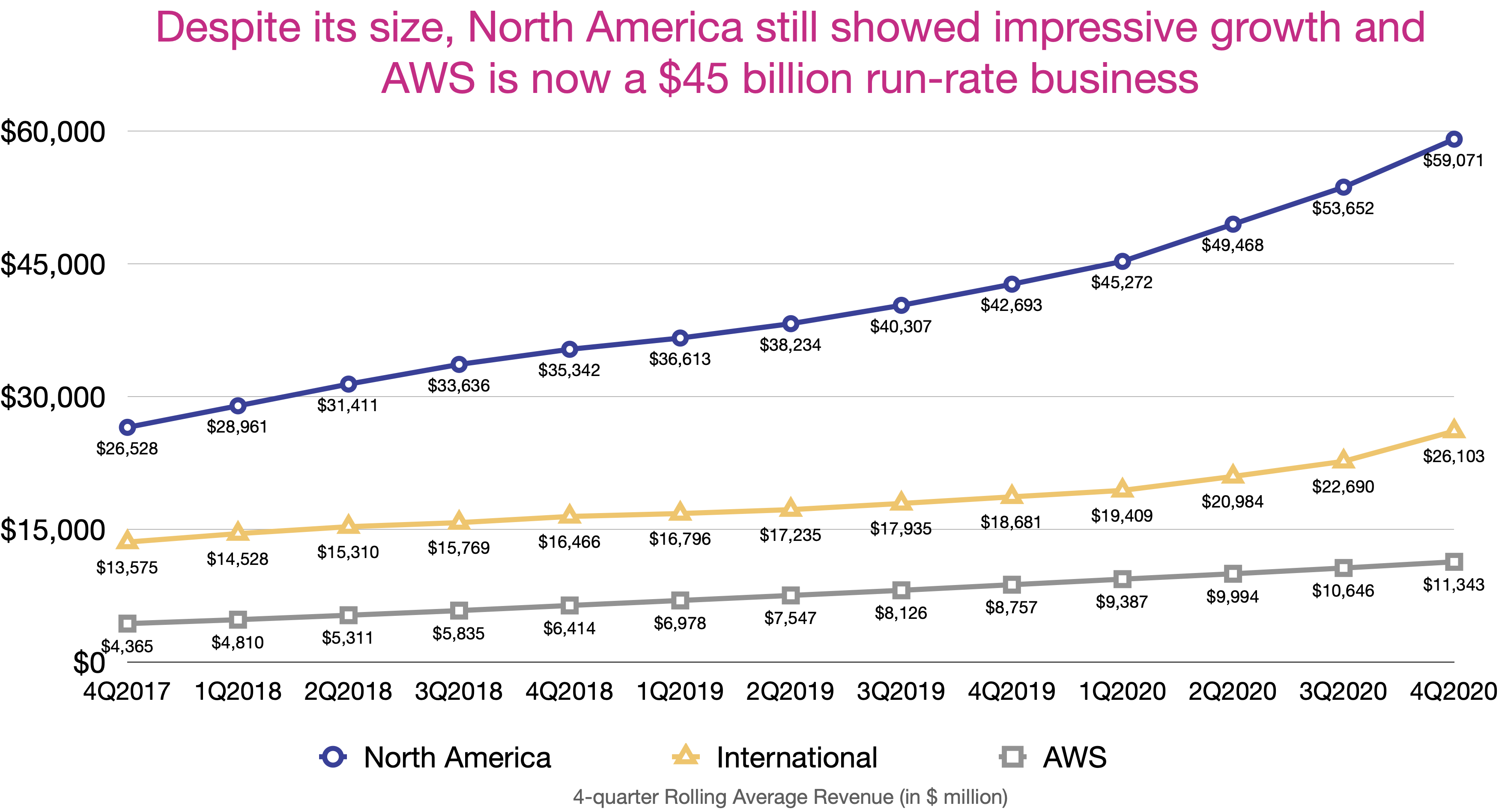 Amazon recorded $125 billion in sales in Q4 FY2020, making its four-quarter rolling average revenue now almost $100 billion. For Q1 FY2021, Amazon’s guidance is to generate between $100 and $106 billion in revenue. More impressively, the quarterly revenue grew at least 37% YoY each. In terms of major business segments, North America is still the biggest piece of the pie, yet it still outgrows International and AWS. The latter is now a $45 billion run-rate business. Looking deeper at the business lines, Online Stores, 3rd Party Marketplace and AWS are still the three biggest, but the fastest growing is Advertising, which stands at the run rate of $21 billion. In terms profitability, Amazon used to run in the red with International. Not any more. International has been profitable for the last 3 consecutive quarters, making all three major business segments of Amazon profitable.