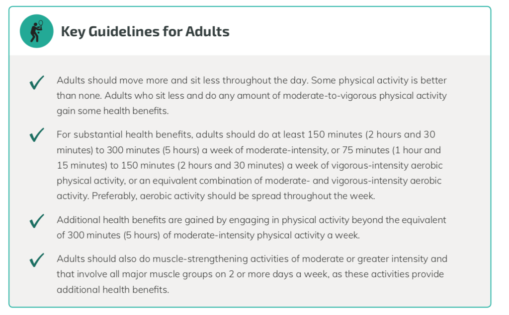 “In the end, the 2018 HHS panel concluded that some physical activity is better than none, that more physical activity provides additional health benefits, and that for “substantial health benefits” adults should do at least 150 minutes per week of moderate-intensity or 75 minutes per week of vigorous-intensity aerobic physical activity, or an equivalent combination of the two. (Moderate-intensity aerobic activity is defined as between 50 and 70 percent of your maximum heart rate; vigorous-intensity aerobic activity is 70 to 85 percent of your maximum heart rate.) They also reaffirmed the long-standing recommendation that children need an hour of exercise a day. Finally, they recommended everyone also do some weights twice a week.”