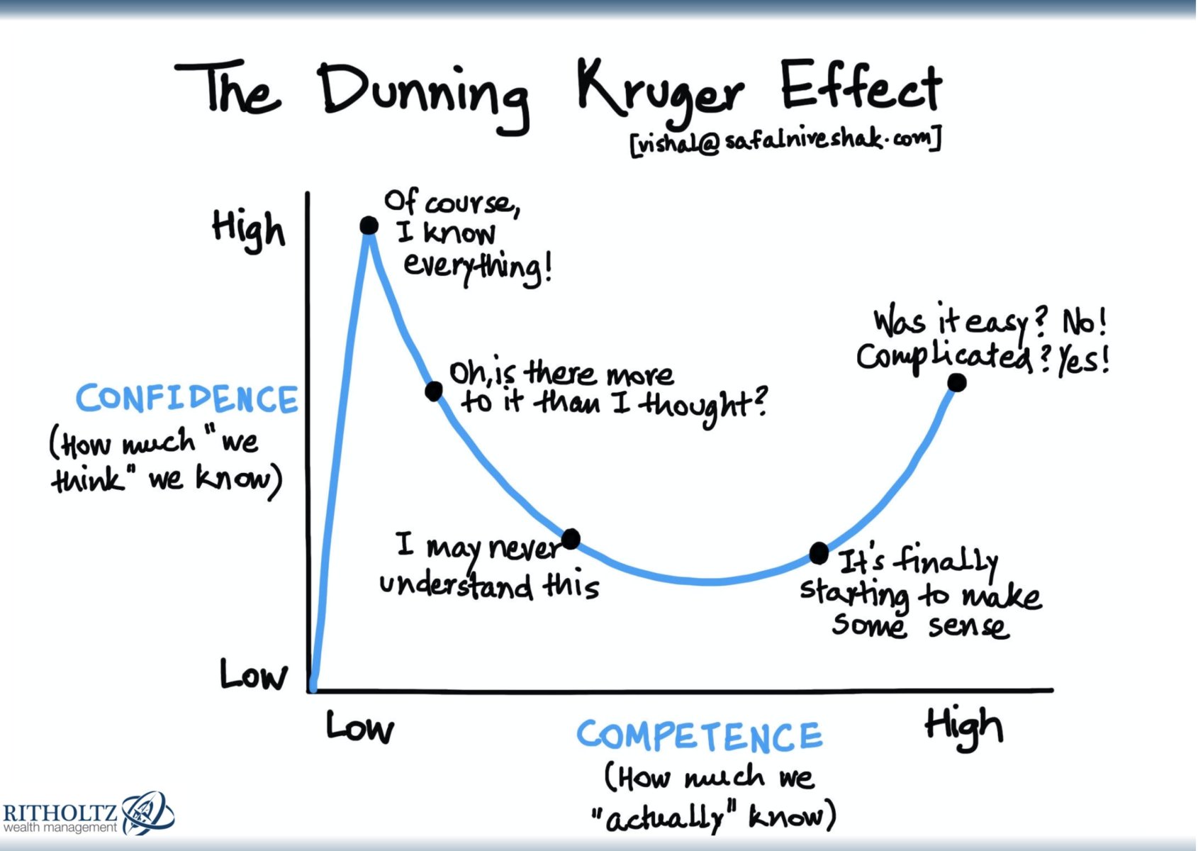 The Dunning Kruger Effect is a bias in which people mistakenly overestimate their ability at something. Barry Ritholtz had a graphic that succinctly illustrates the Effect