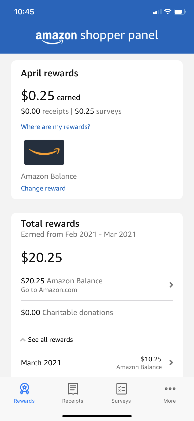 Receipts can be uploaded via a phone camera. Based on my experience so far, the app is fairly receptive towards even wrinkled receipts and those that have small tears. Email receipts are qualified, as long as they are sent to receipts@panel.amazon.com from the same email that a participant uses to register an account. I got a car wash voucher from a dealership a while back and used it at a random fuel station in Omaha. The receipt from the car wash was still accepted, much to my surprise, because it didn’t have any card information. Since February 2021, I completed two surveys and received 25 cents for each. The surveys featured only one question each time and it was pretty basic such as, I paraphrase here, “where did you get information for your online purchases?”.