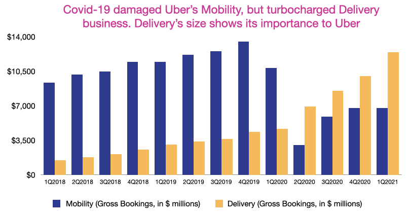 Yesterday, Uber released their financial results for Q1 FY2021. In general, the overall business mostly recovered from the impact of the pandemic. Even though it made fewer trips and less revenue than last year, gross bookings rose by 24%. Mobility Gross Bookings continued to be down year over year as countries are still battling Covid-19. On the other hand, Delivery Gross Bookings increased by 166%, up to $12.5 billion from $4.7 billion a year ago, due to strong demand. To put it in perspective, Uber generated almost as much Gross Bookings in Delivery in Q1 2021 as it did in the entire year of 2019.