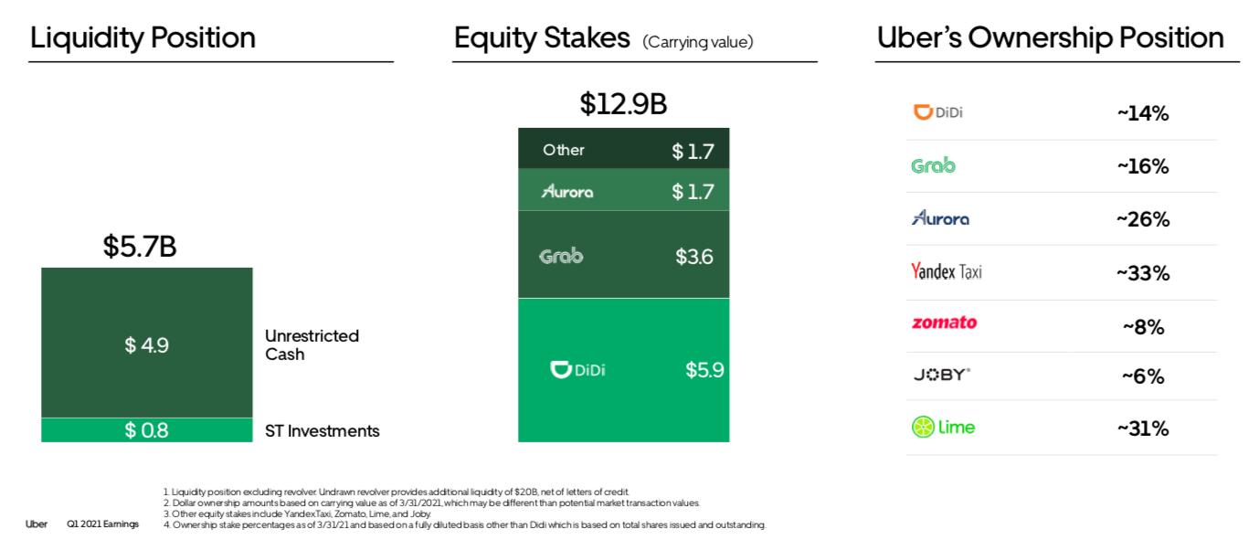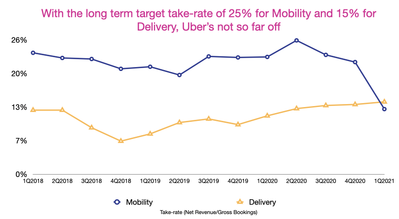 In Q1 2021, the company’s adjusted EBITDA was -$360 million, but it was up from the loss of $612 million a year ago. Mobility was still profitable, albeit down 49% YoY. Delivery and Freight remained loss-makers, but the loss narrowed compared to Q1 2020. According to Uber, Delivery was profitable on the adjusted EBITDA basis in 12 markets in Q1 2021. Take rates for Mobility and Delivery were 12.6% and 14%, respectively. Mobility’s take-rate dropped from their usual 20% range because Uber took a draw-down of $600 million for driver expenses following the High Court’s verdict in the UK that would force Uber to classify drivers as employees. Without the draw-down, Mobility take rate would be 21.5%. Delivery’s take rate has been steadily increasing since Q4 2019. As the platform continues to grow in scale and fine-tune its operations for higher efficiency, I expect to see Delivery take rate to hover around the 14-15% range.