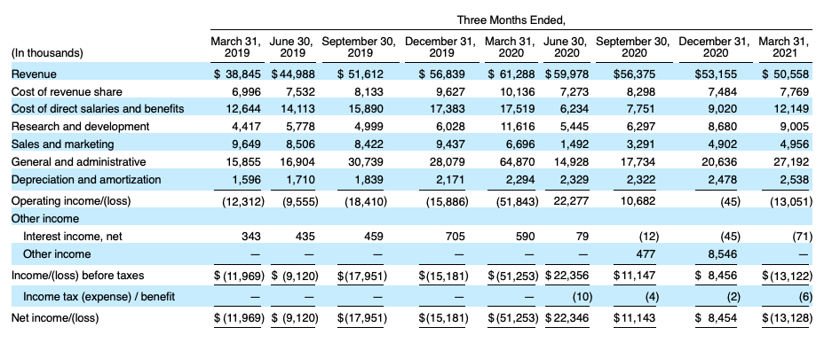 In the last two years, CLEAR had positive operating income only in two quarters, at the height of Covid. What concerns me isn’t the lack of explosive growth many may expect. It is the lack of economies of scale. Compared to 2019 quarters, the quarter ending March 31, 2021 didn’t seem to show that CLEAR gained much more efficiency. Granted, the impact of Covid-19 is undisputed and the company did seem to transfer some marketing expenses to R&D; which is a positive sign for a technology platform. Yet, the two biggest expense line items in Direct Salaries and G&A, mainly stock-based compensation, still dominate their cost structure. That makes me wonder when this trend will end, given that historical data in the last two years indicate otherwise.